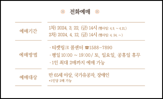 전화예매는 ① 만 65세 이상, ② 국가유공자, ③ 장애인 분들만 가능하며, 티켓링크 콜센터(☎1588-7890)로 전화하셔서 예매하실 수 있습니다.