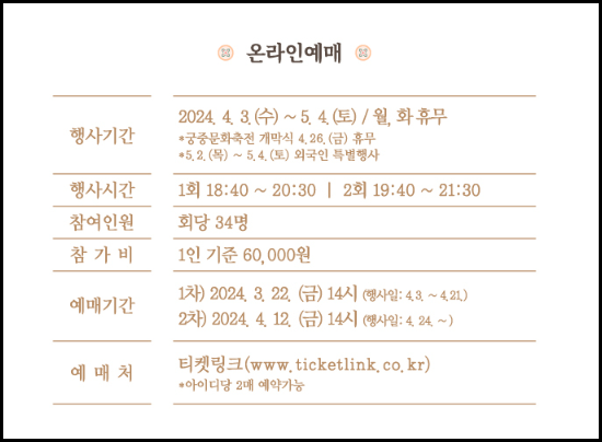 위의 3가지에 해당되지 않으시는 분들은 온라인 예매만 가능합니다. 예매는 티켓링크 홈페이지에서 진행됩니다. 아래에 2024년 경복궁 야간개장 예매 페이지로 이동하는 바로가기 버튼을 마련해 두었으니, 편하게 예매하시기 바랍니다.