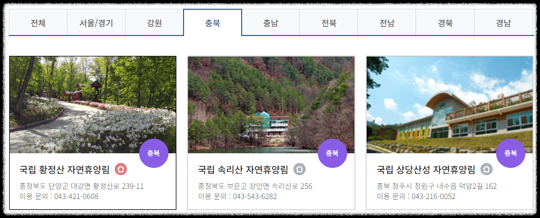 국립자연휴양림 지역별 검색방법