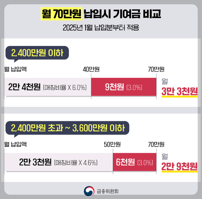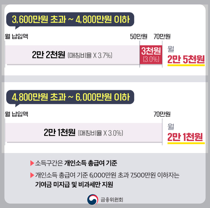 2025년 1월부터는 정부 매칭금이 실제 납입한 금액 전체에 대해 적용됩니다. 초과 금액에 대해서도 3%의 정부 지원금이 추가로 제공됩니다. 아래는 매월 70만 원을 납입했을 경우 각 소득 구간별 지원금을 정리한 내용입니다.