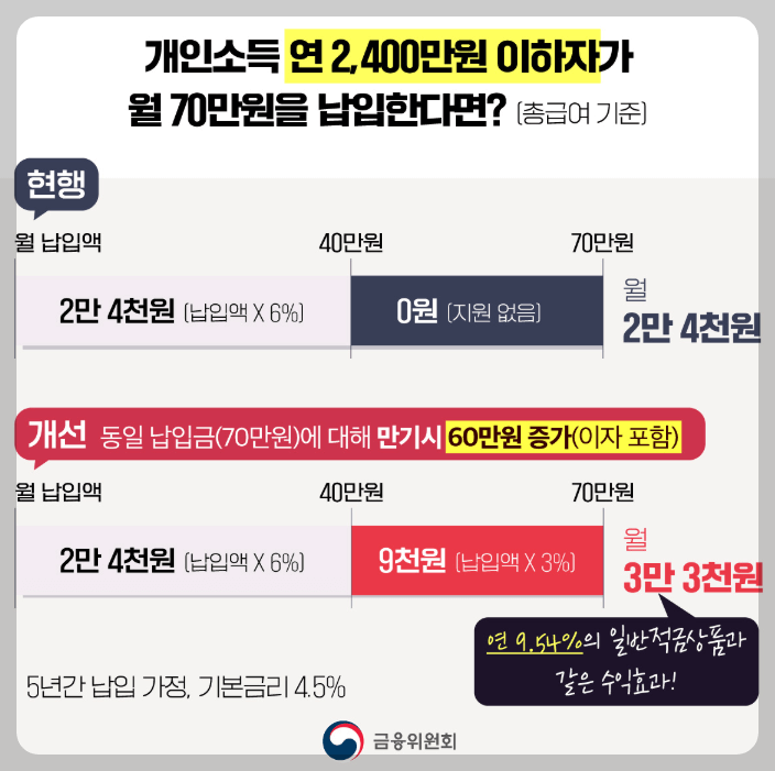 - 2025년부터는 초과된 20만 원에 대해 3%의 정부 매칭금이 추가로 적용되며, 총 2만 9천 원을 지원받게 됩니다.